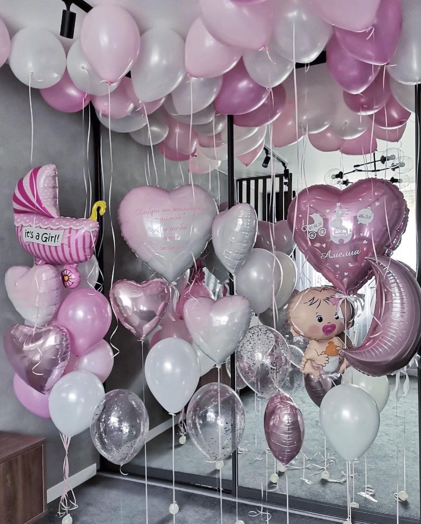 #выписка #выпискаизроддома #новорожденная #дочка #девочка #розовый #белый #метриканашаре #сердцегигант #размермакси #пупсик #луна #коляска #шарыподпотолок