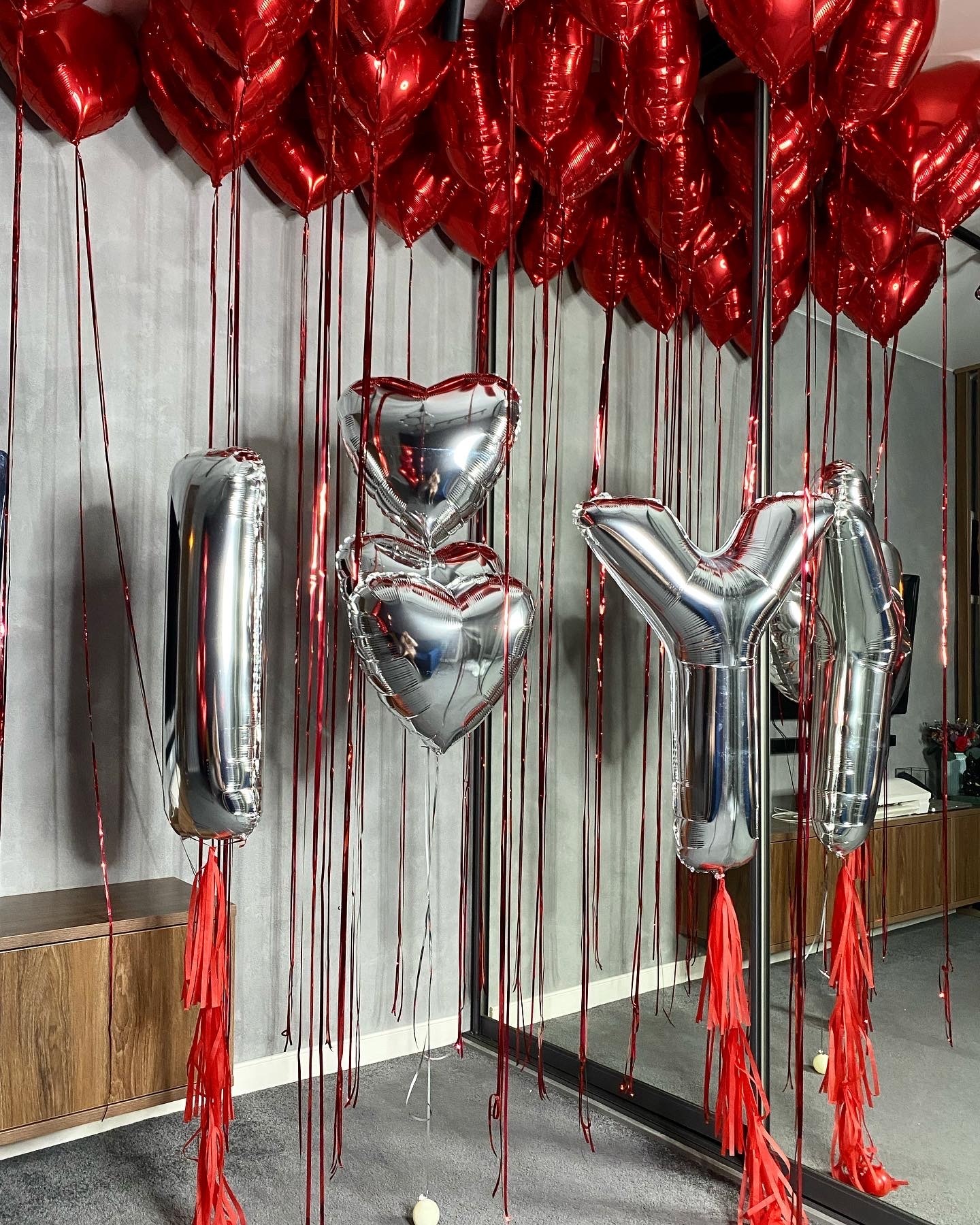 Шар сердце красное с дождиком - 20 шт (под потолок)