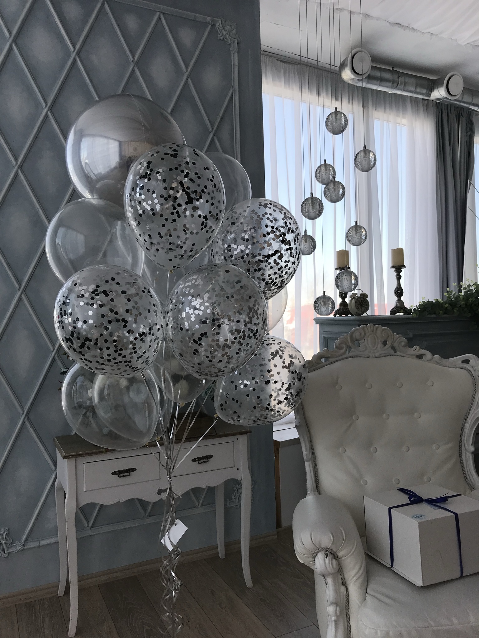 #деньрождения #серебро #16лет #конфетти #шарыподпотолок #метал #нежный #стильный #девушке #парню #подростку